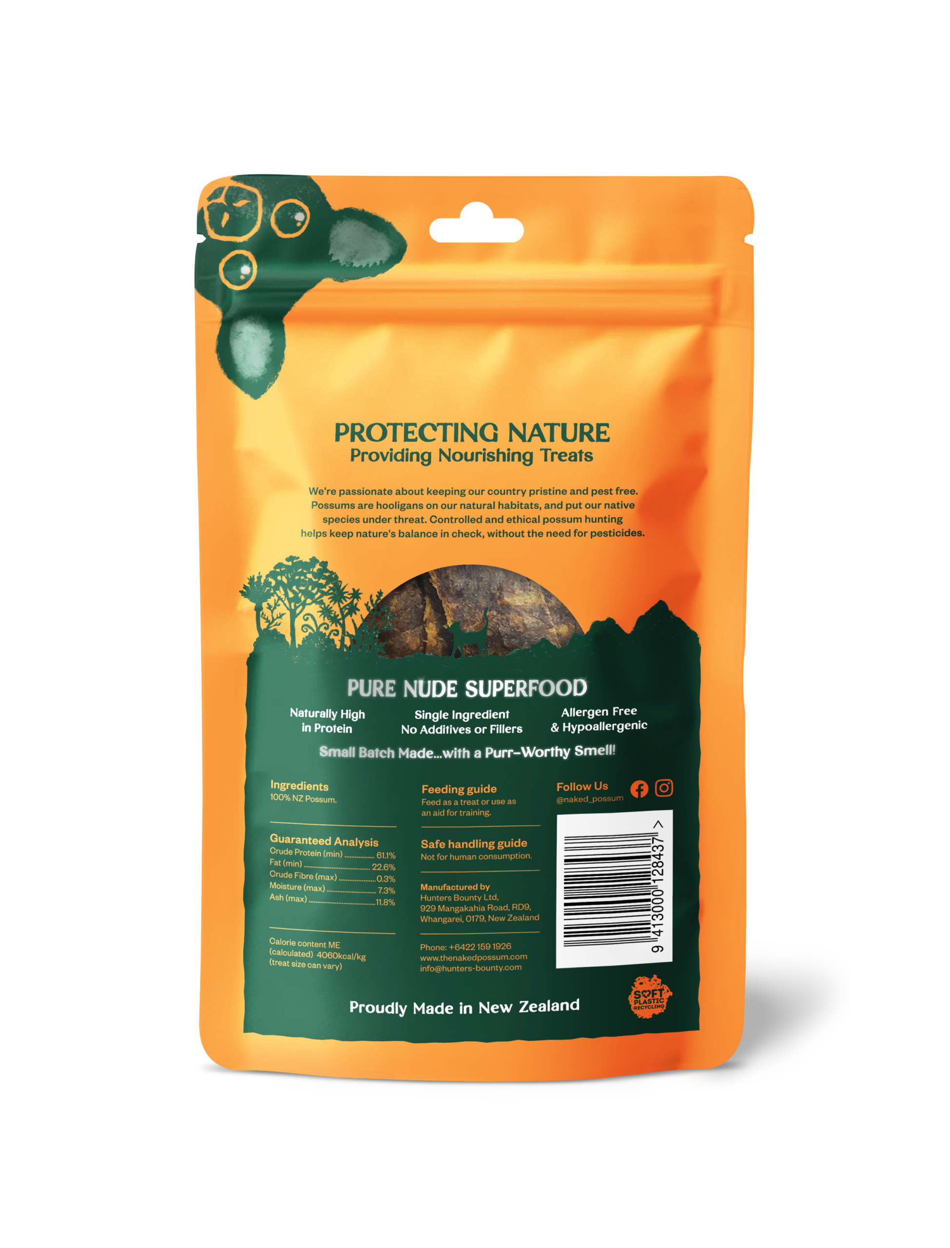 Real Possum treats, air dried to lock in the nutrition and taste. Purrfect for rewards, training, snacks, or get creative with enrichment activities and healthy recipes.