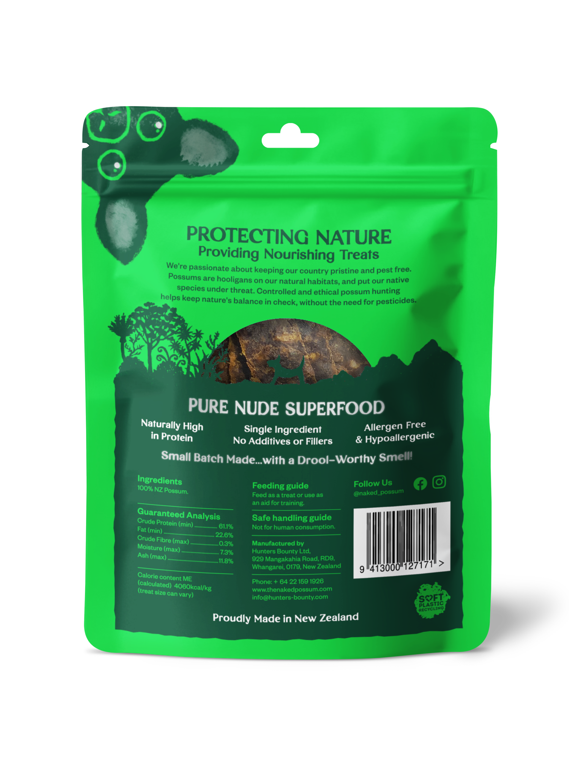 Real Possum treats, air dried to lock in the nutrition and taste. Perfect for rewards, training, snacks, or get creative with enrichment activities and healthy recipes.